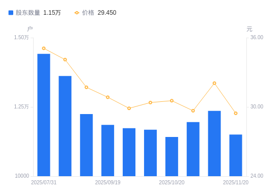 近一年(2024年11月20日至2025年11月20日),大宏立A股股东户数从1.21万户,减低至1.15万户,降幅4.62%,区间股价上涨1.97%。