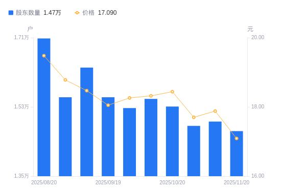 近一年(2024年11月20日至2025年11月20日),双象股份A股股东户数从1.71万户,减低至1.47万户,降幅14.13%,区间股价上涨10.40%。
