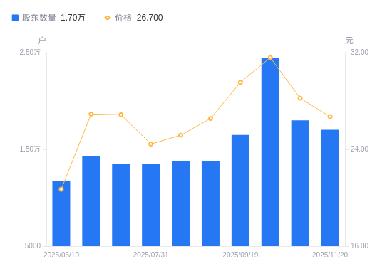 近一年(2024年11月20日至2025年11月20日),天山电子A股股东户数从1.23万户,增加至1.7万户,增幅38.88%,区间股价上涨84.92%。