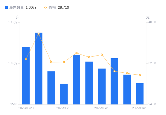 近一年(2024年11月20日至2025年11月20日),华康洁净A股股东户数从9454户,增加至1万户,增幅5.94%,区间股价上涨42.83%。