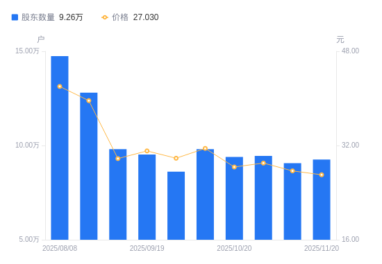 近一年(2024年11月20日至2025年11月20日),建设工业A股股东户数从2.8万户,增加至9.26万户,增幅230.71%,区间股价上涨126.76%。