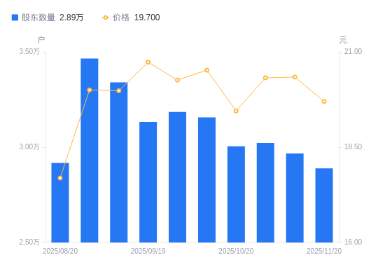 近一年(2024年11月20日至2025年11月20日),美亚光电A股股东户数从3.04万户,减低至2.89万户,降幅5.02%,区间股价上涨34.65%。