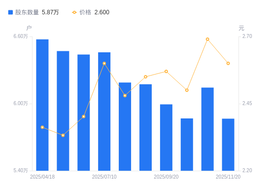 近一年(2024年11月20日至2025年11月20日),甘肃能化A股股东户数从6.71万户,减低至5.87万户,降幅12.57%,区间股价下跌5.87%。