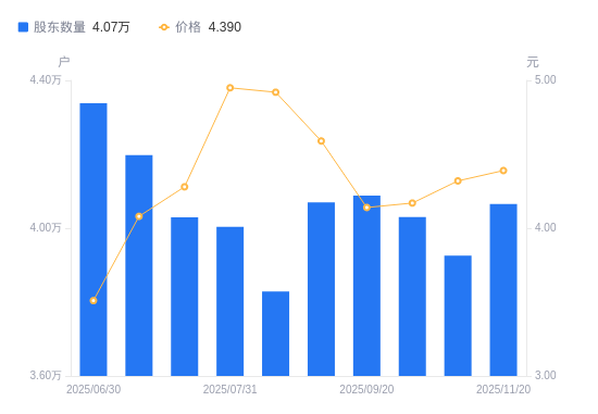 近一年(2024年11月20日至2025年11月20日),三钢闽光A股股东户数从4.78万户,减低至4.07万户,降幅15.00%,区间股价上涨18.33%。