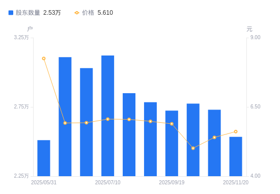 近一年(2024年12月20日至2025年11月20日),富煌钢构A股股东户数从2.24万户,增加至2.53万户,增幅13.36%,区间股价下跌26.86%。