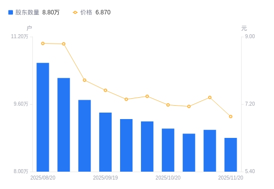 近一年(2024年11月20日至2025年11月20日),华峰超纤A股股东户数从9.86万户,减低至8.8万户,降幅10.76%,区间股价下跌10.49%。