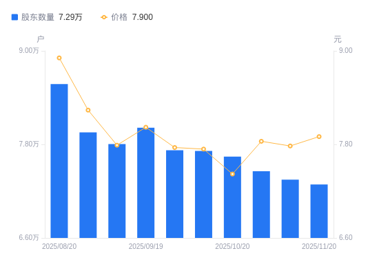近一年(2024年11月20日至2025年11月20日),远东传动A股股东户数从7.75万户,减低至7.29万户,降幅6.00%,区间股价上涨23.63%。