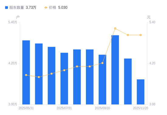 近一年(2024年11月30日至2025年11月20日),金新农A股股东户数从4.65万户,减低至3.73万户,降幅19.74%,区间股价上涨16.98%。