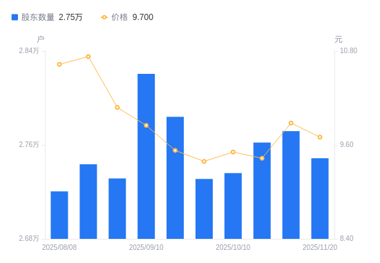 近一年(2024年11月20日至2025年11月20日),克明食品A股股东户数从3.16万户,减低至2.75万户,降幅13.10%,区间股价上涨6.76%。