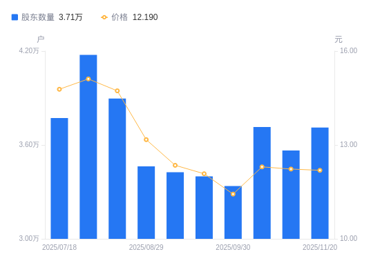 近一年(2024年11月20日至2025年11月20日),赛升药业A股股东户数从2.75万户,增加至3.71万户,增幅34.83%,区间股价上涨56.89%。