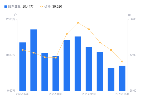 近一年(2024年12月31日至2025年11月20日),银之杰A股股东户数从13.8万户,减低至10.44万户,降幅24.31%,区间股价下跌4.91%。