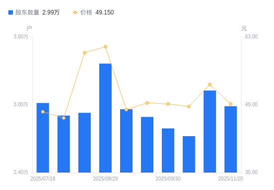 近一年(2024年11月20日至2025年11月20日),中天火箭A股股东户数从2.3万户,增加至2.99万户,增幅30.09%,区间股价上涨15.07%。