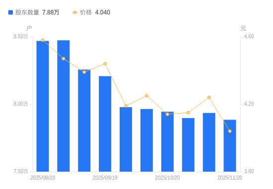 近一年(2024年11月20日至2025年11月20日),保税科技A股股东户数从5.88万户,增加至7.88万户,增幅34.08%,区间股价上涨12.22%。