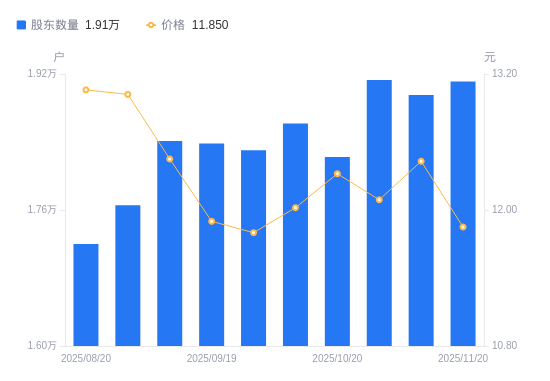 近一年(2024年11月20日至2025年11月20日),中原传媒A股股东户数从3.14万户,减低至1.91万户,降幅39.16%,区间股价上涨16.06%。