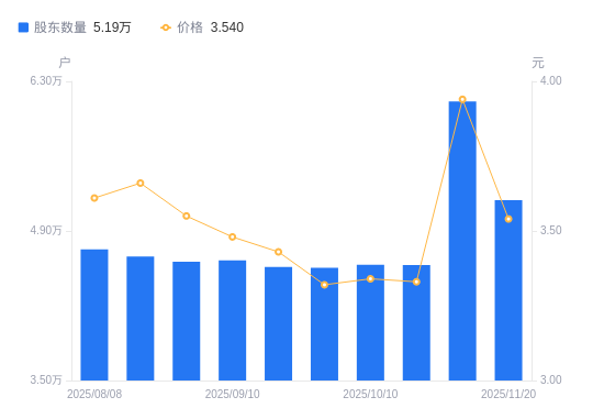 近一年(2024年11月20日至2025年11月20日),新能泰山A股股东户数从4.4万户,增加至5.19万户,增幅18.03%,区间股价下跌9.92%。