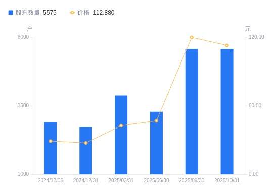近一年(2024年12月6日至2025年10月31日),浙海德曼A股股东户数从2905户,增加至5575户,增幅91.91%,区间股价上涨273.77%。
