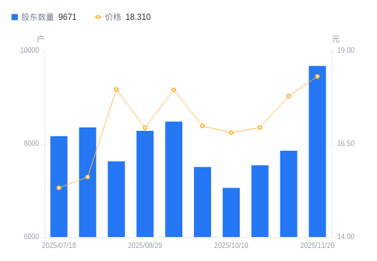 近一年(2024年11月20日至2025年11月20日),名雕股份A股股东户数从8103户,增加至9671户,增幅19.35%,区间股价上涨43.79%。