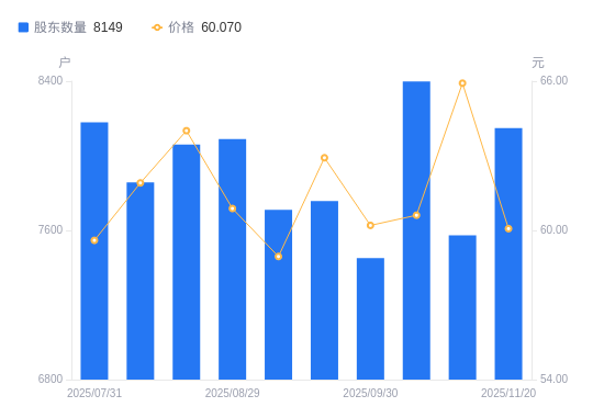 近一年(2024年11月20日至2025年11月20日),美信科技A股股东户数从7932户,增加至8149户,增幅2.74%,区间股价下跌4.16%。