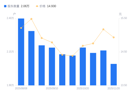 近一年(2024年11月20日至2025年11月20日),桂林三金A股股东户数从1.68万户,增加至2.06万户,增幅22.66%,区间股价上涨4.63%。