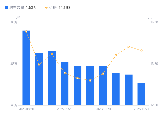 近一年(2024年11月20日至2025年11月20日),启迪设计A股股东户数从1.53万户,减低至1.53万户,降幅0.16%,区间股价上涨19.95%。