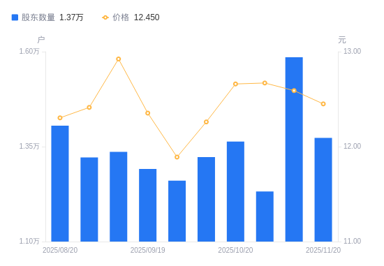 近一年(2024年11月20日至2025年11月20日),美能能源A股股东户数从1.6万户,减低至1.37万户,降幅13.99%,区间股价上涨28.56%。
