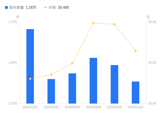 近一年(2024年12月31日至2025年11月20日),同星科技A股股东户数从1.65万户,减低至1.26万户,降幅23.45%,区间股价上涨3.08%。