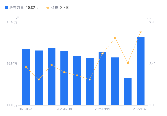 近一年(2024年12月31日至2025年11月20日),华侨城AA股股东户数从11.67万户,减低至10.82万户,降幅7.24%,区间股价下跌0.73%。