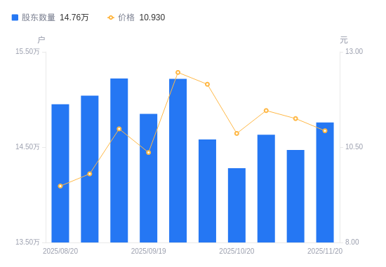 近一年(2024年11月20日至2025年11月10日),中国宝安A股股东户数从17.01万户,减低至14.47万户,降幅14.93%,区间股价上涨15.86%。