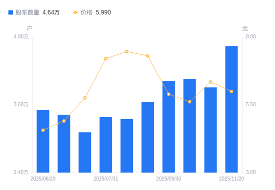 近一年(2024年11月20日至2025年11月20日),濮耐股份A股股东户数从3.72万户,增加至4.64万户,增幅24.71%,区间股价上涨47.86%。
