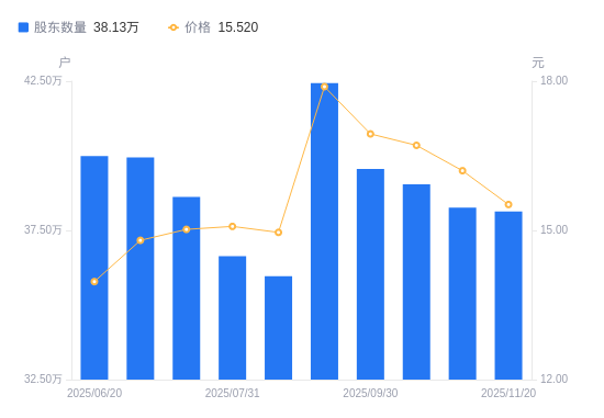 近一年(2024年12月10日至2025年11月20日),中国长城A股股东户数从51.77万户,减低至38.13万户,降幅26.34%,区间股价下跌7.84%。