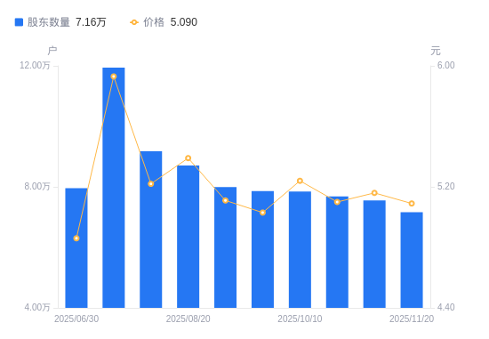 近一年(2024年11月20日至2025年11月20日),韶能股份A股股东户数从5.02万户,增加至7.16万户,增幅42.66%,区间股价上涨29.09%。