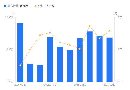 近一年(2024年11月30日至2025年10月31日),广联达A股股东户数从9.93万户,减低至9.75万户,降幅1.79%,区间股价上涨15.82%。