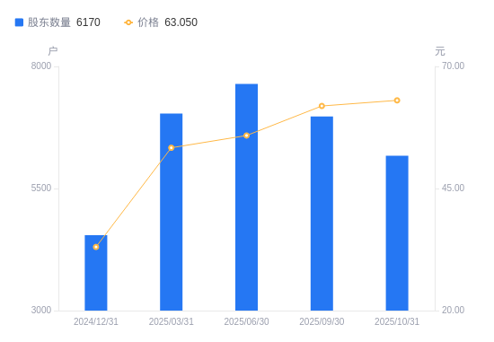 近一年(2024年12月31日至2025年10月31日),迈信林A股股东户数从4543户,增加至6170户,增幅35.81%,区间股价上涨87.19%。