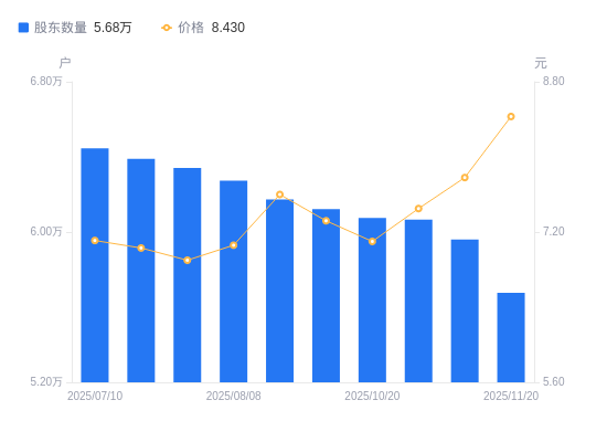 近一年(2024年11月20日至2025年11月20日),浙江美大A股股东户数从7.01万户,减低至5.68万户,降幅19.05%,区间股价上涨17.57%。
