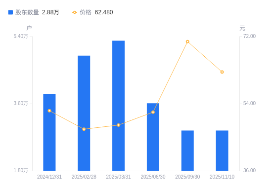近一年(2024年12月31日至2025年11月10日),东方电缆A股股东户数从3.85万户,减低至2.88万户,降幅25.26%,区间股价上涨19.21%。