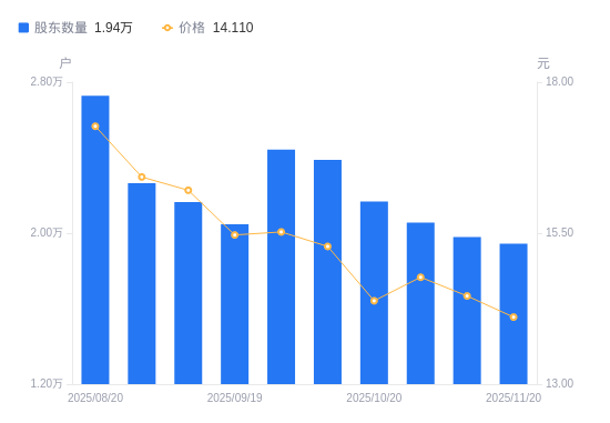 近一年(2024年11月20日至2025年11月20日),金时科技A股股东户数从7945户,增加至1.94万户,增幅144.71%,区间股价上涨120.26%。
