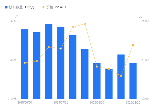 近一年(2024年11月20日至2025年11月20日),华是科技A股股东户数从1.63万户,减低至1.32万户,降幅19.02%,区间股价下跌5.33%。
