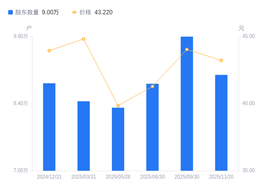 近一年(2024年12月31日至2025年11月20日),通策医疗A股股东户数从8.82万户,增加至9万户,增幅1.98%,区间股价下跌4.72%。