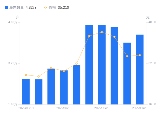 近一年(2024年11月20日至2025年11月20日),川环科技A股股东户数从2.36万户,增加至4.32万户,增幅83.19%,区间股价上涨75.49%。