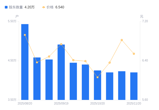 近一年(2024年11月20日至2025年11月10日),新朋股份A股股东户数从3.38万户,增加至4.23万户,增幅25.15%,区间股价上涨22.40%。