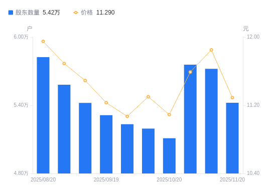 近一年(2024年11月29日至2025年11月20日),青龙管业A股股东户数从5.73万户,减低至5.42万户,降幅5.39%,区间股价下跌7.55%。