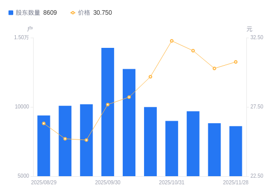 近一年(2024年11月29日至2025年11月28日),耐普矿机A股股东户数从6979户,增加至8609户,增幅23.36%,区间股价上涨8.54%。