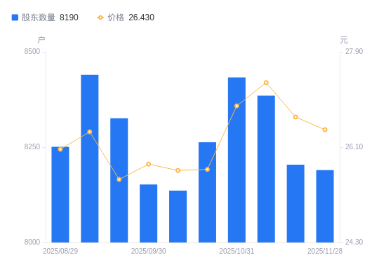 近一年(2024年12月20日至2025年11月28日),研奥股份A股股东户数从9971户,减低至8190户,降幅17.86%,区间股价上涨25.84%。