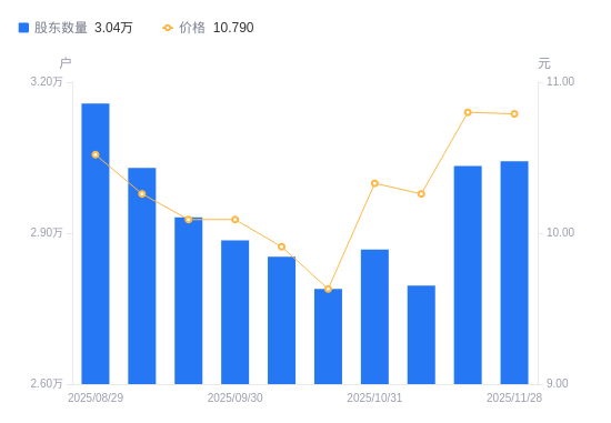 近一年(2024年11月29日至2025年11月28日),世纪天鸿A股股东户数从3.23万户,减低至3.04万户,降幅5.87%,区间股价下跌7.34%。