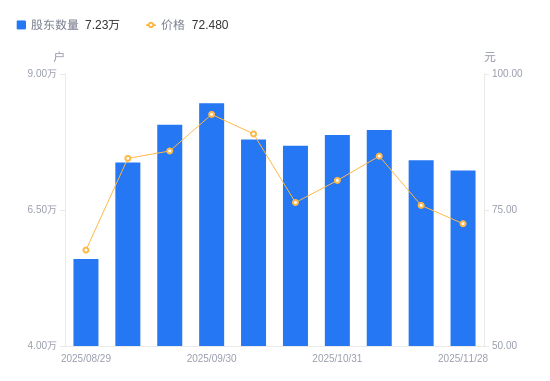 近一年(2024年11月29日至2025年11月28日),锦浪科技A股股东户数从5.38万户,增加至7.23万户,增幅34.30%,区间股价上涨8.28%。