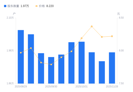 近一年(2024年11月29日至2025年11月28日),益盛药业A股股东户数从2.15万户,减低至1.97万户,降幅8.00%,区间股价上涨10.04%。