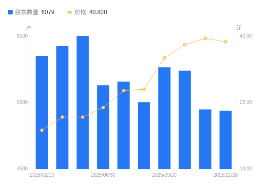 近一年(2024年12月31日至2025年11月28日),新风光A股股东户数从7937户,减低至6079户,降幅23.41%,区间股价上涨82.81%。