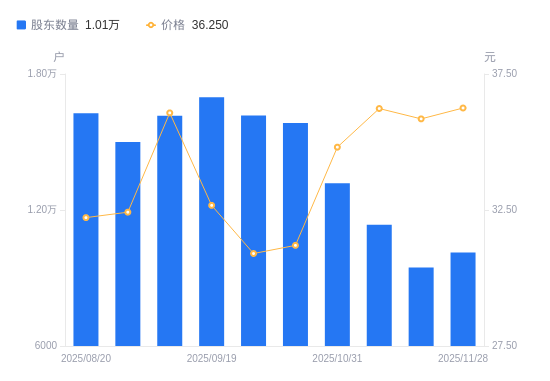 12月1日消息,数据显示,截至2025年11月28日,共创草坪A股股东总户数为1.01万户,较上期(2025年11月20日)增加655户,增幅6.92%。公司最新A股总股本为4.03亿股,其中流通A股4.01亿股,户均持有流通A股数量为3.97万股,较上期减少2744.71股,降幅6.47%;户均持流通A股市值143.78万元,较上期减少8.25万元,降幅5.43%。