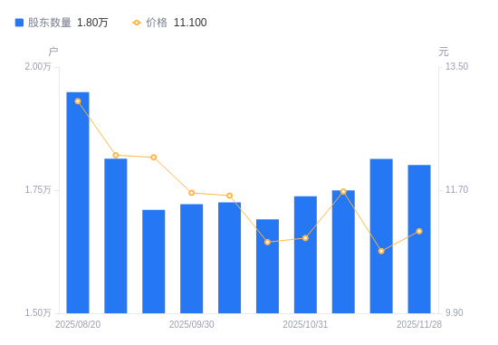 近一年(2024年12月20日至2025年11月28日),聚合顺A股股东户数从1.35万户,增加至1.8万户,增幅32.99%,区间股价下跌1.39%。