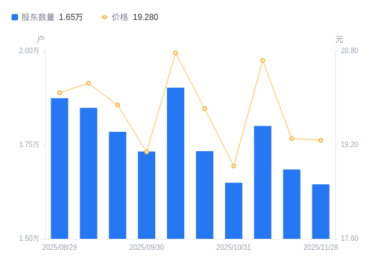 近一年(2024年11月29日至2025年11月28日),金利华电A股股东户数从7665户,增加至1.65万户,增幅114.65%,区间股价上涨25.03%。